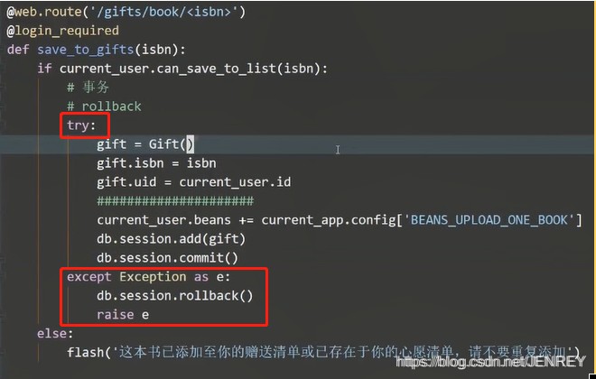 为什么一定要执行db.session.rollback(),是因为如果我们的程序执行到db.session.commit()这里出现了错误,又没有执行rollback的话,那么不仅仅是这次的插入失败了,后续的其他操作sqlalchemy也是会失败的。所以建议大家一定要回滚起来!