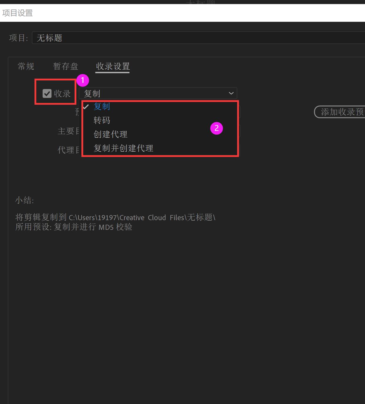 pr cc 项目设置里提供了收录设置,这是为了让项目编辑时,快速规范素材格式使用的一种简便方法。假设你在f盘某文件夹有一些影像,但你实际调用时,希望将其复制到项目文件夹下,以防编辑时不会影响源素材,这时就需要使用“收录设置”。当然,这只是其中“收录设置”一种作用,更多的功能还需要结合预设浏览器与adobe media encoder软件使用。