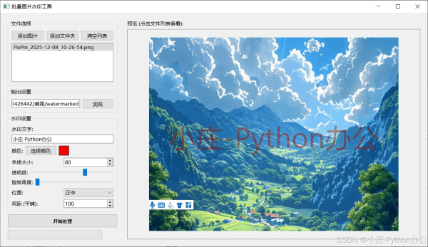 在日常工作和自媒体运营中,我们经常需要给大量的图片添加水印以保护版权。市面上的工具要么收费,要么功能单一。今天,我们将使用 python 强大的 gui 库 pyqt5 和图像处理库 pillow (pil),亲手打造一个免费、开源且功能强大的批量水印工具。