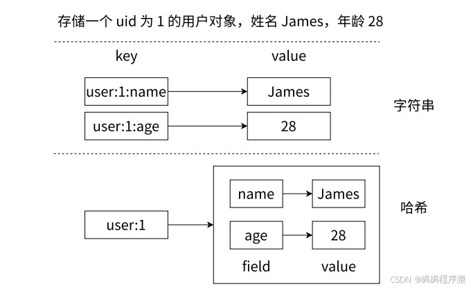 在 redis 中,哈希类型是指值本⾝⼜是⼀个键值对结构,形如 key = “key”,value = { { field1, value1 }, …, {fieldn, valuen} },在redis中为了与key - value作区分,将hash类型键值对结构表示为filed - value。