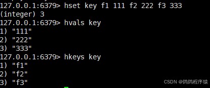 | hvals key | 获取所有的 value | o(k), k 是 field 个数 |