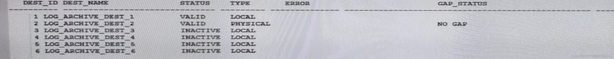 set lines 222 pages 100 col error for a20 col gap_status for a20 col dest_name for a20 select dest_id,dest_name,status,type,error,gap_status from v$archive_dest_status where type='physical';