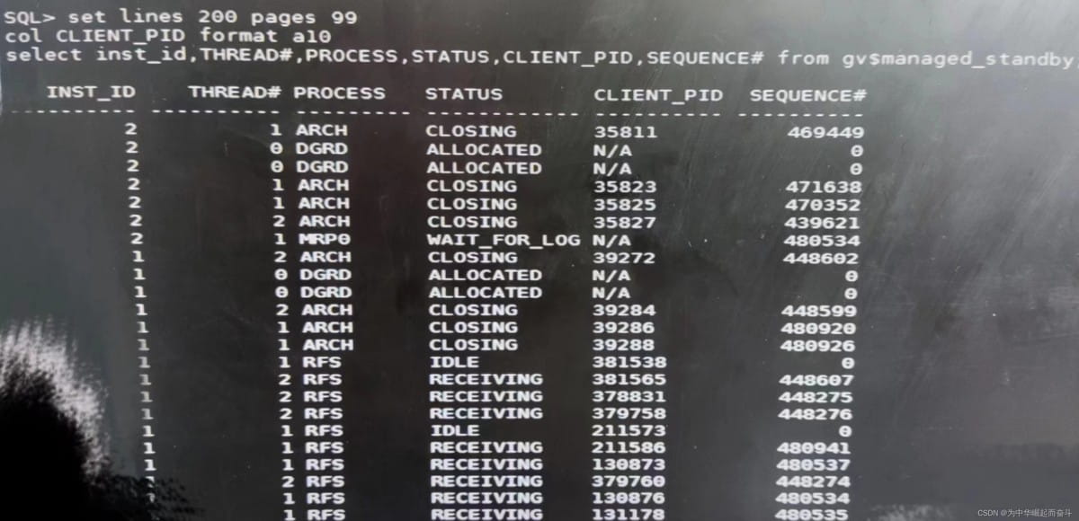 set lines 222 pages 100 col client_pid for a10 select inst_id,thread#,process,status,client_pid,sequence# from gv$managed_standby;