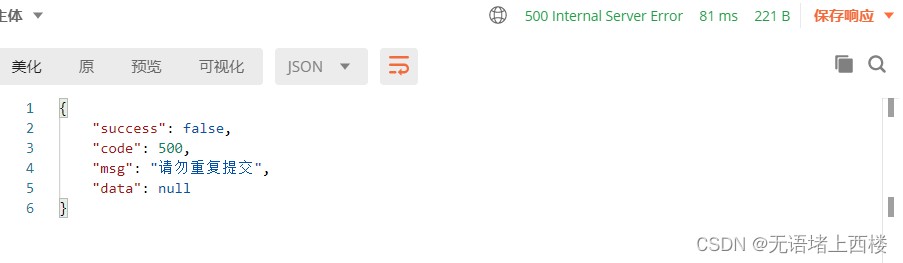 使用 redis 分布式锁来判断请求是否重复提交。调用 rediscache.setnxcacheobject() 方法,尝试向缓存中设置键值对,如果设置成功(返回值为 true),则证明没有重复提交。若设置失败(返回值为 false),则抛出 businessexception 异常,表示重复提交。