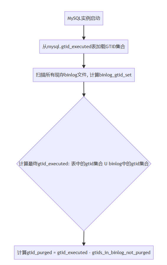 - 初始化基础值:实例启动时,首先会从 mysql.gtid_executed 表中读取所有记录,将这些记录的 gtid 集合合并,作为初始化 @@global.gtid_executed 系统变量的基础值。这是最快、最主要的数据来源。