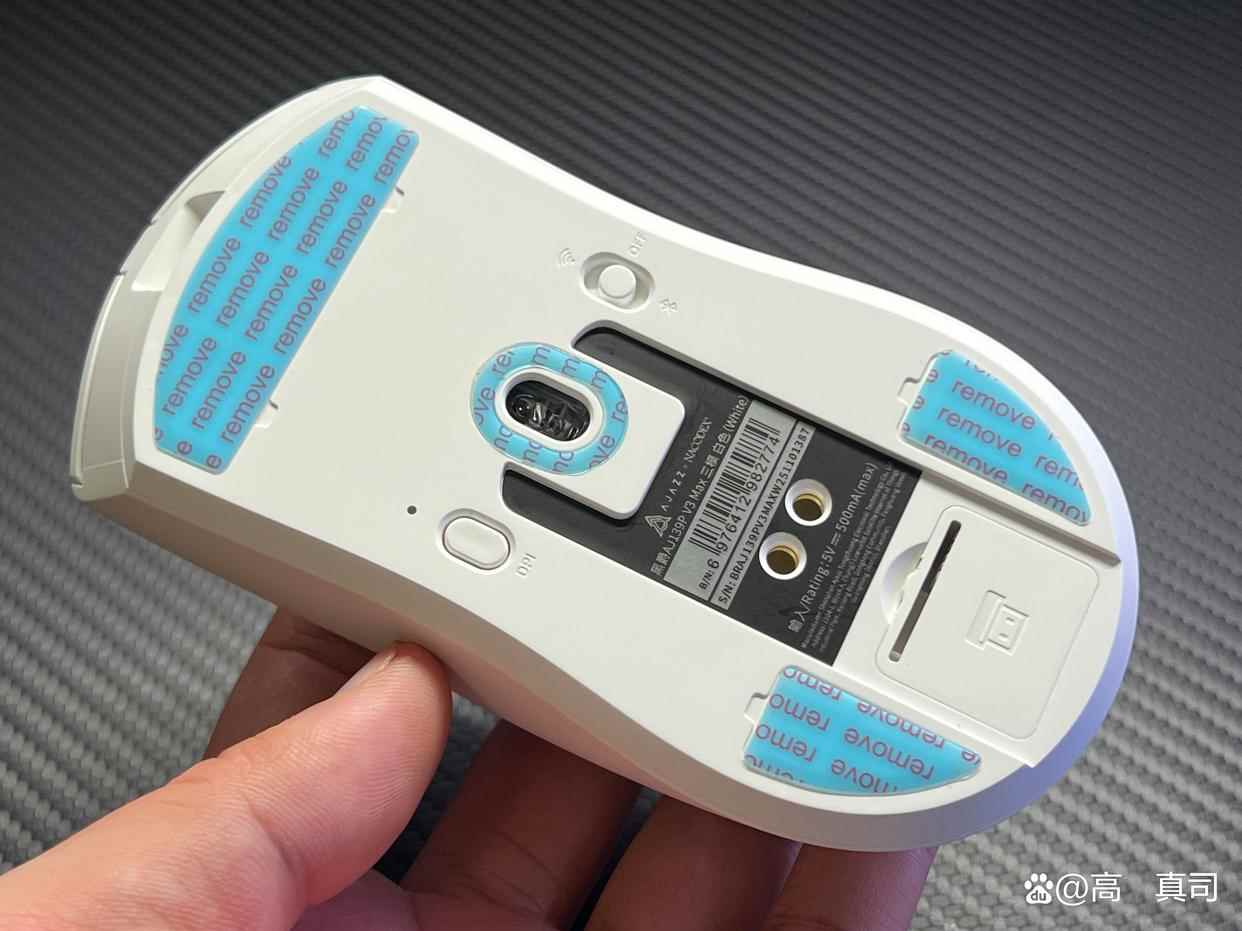 鼠标底部因为做了个磁吸充电的卡合槽,所以没能给到上下大脚贴。左边是dpi调节按键,右边是三模切换开关,下方是2.4g接收器的磁吸收纳仓。