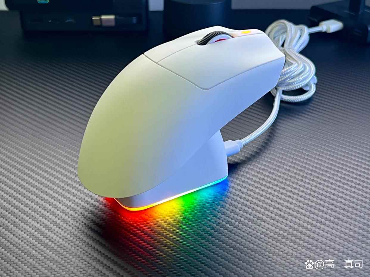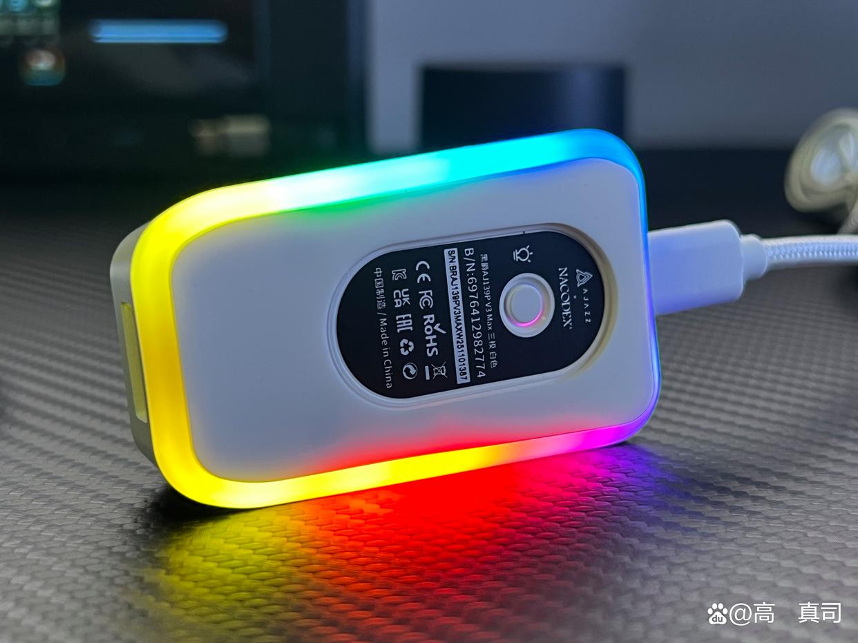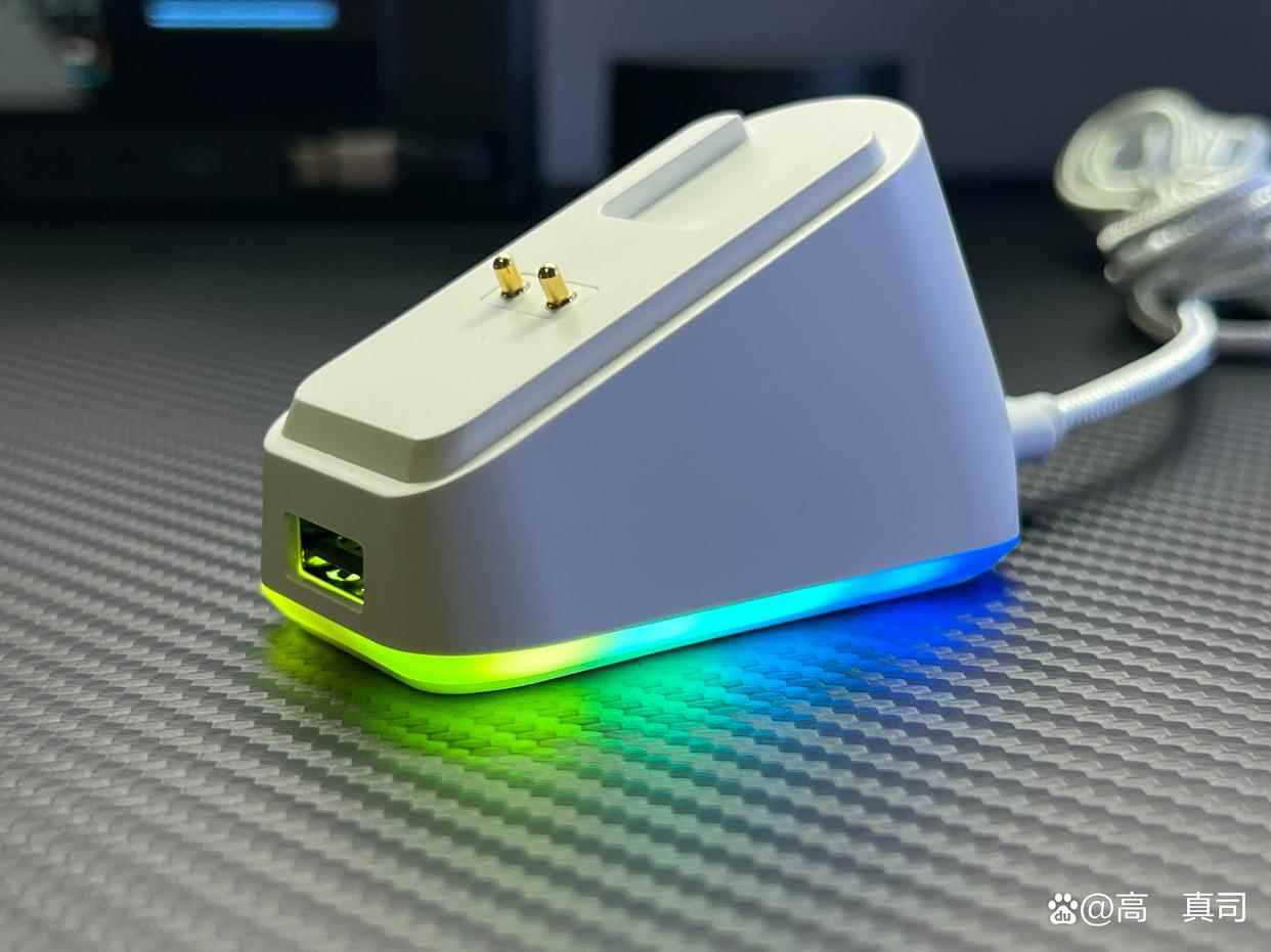 磁吸充电模块底部是一圈硕大的橡胶防滑脚垫,外围有一圈环绕式的rgb灯条,底部是rgb开关。情绪价值这块,虽然鼠标没有给到rgb但充电底座很好的弥补了这一点。