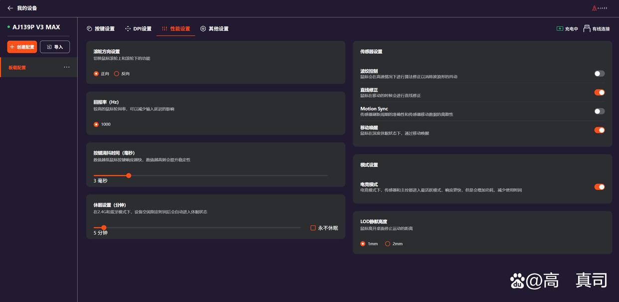 驱动这块依旧是黑爵的网页驱动,我手里是max版的3395传感器,所以功能上会多出不少,比如按键消抖、波纹控制、直线修正、调节静默高度等。