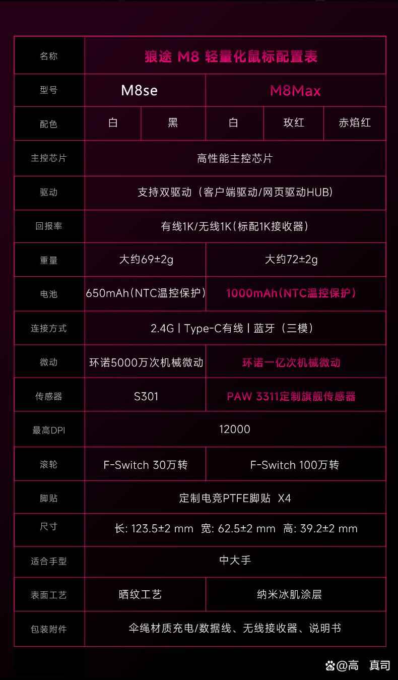 狼途m8其实有两个系列,pro和se,二者差价30,传感器不同,电池续航差了350mah,论性价比的话pro更高,但实在揭不开锅的也可以看看se或者像tsg609无相握、黑爵aj179这些六十多就能拿下的。