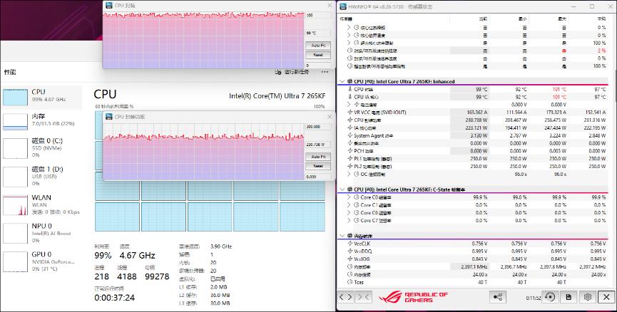 先看看ultra 7 265kf在rog魔霸9x上的大致表现,室温25℃左右,对rog魔霸9x进行单烤fpu测试,ultra 7 265kf功耗稳定在230w上下,性能释放非常猛!这说明了rog魔霸9x主板用料足、240mm液冷散热也压得住,胜任专业应用高满载运行没有什么问题。