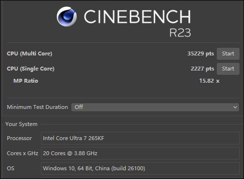 而在大家熟悉的cinebench r23测试中,默认状态下,ultra 7 265kf多核达到了35229分,作为参考,其解锁功耗后的分数约为36000分,从中也可以验证上面的功率释放测试,即rog魔霸9x基本上充分释放出了ultra 7 265kf的性能,表现非常强劲!同时也说明了一点,该机到手即用,基本无需复杂设置。