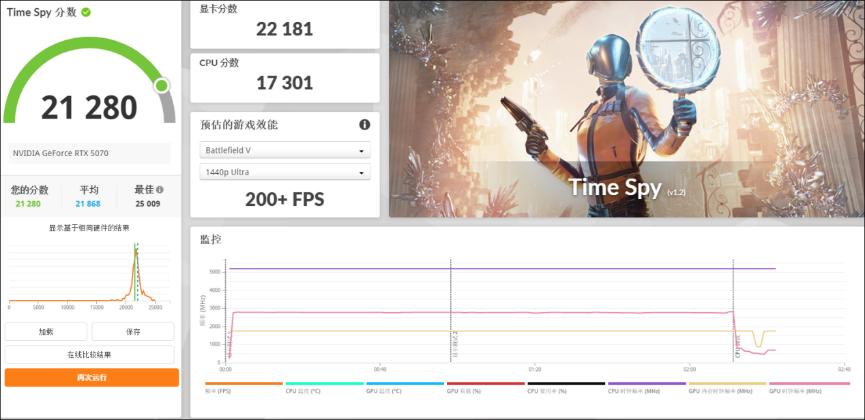 作为一台游戏主机,游戏测试与体验是本次体验的重头戏。老惯例,先看看rog魔霸9x的显卡基准性能测试,依然是大家熟悉的3dmark time spy场景,rtx 5070独显分数为22181,属于标准的满功率rtx 5070(250w)成绩。
