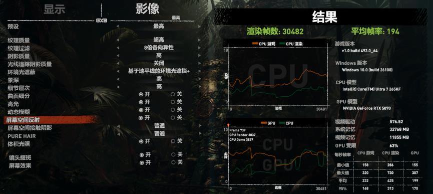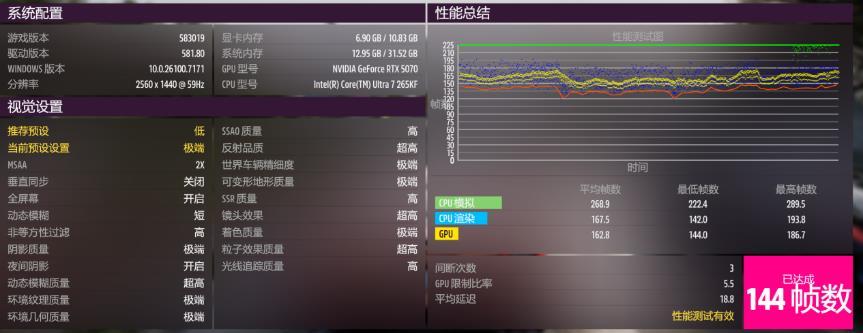 这款游戏优化不错,rog魔霸9x在2k分辨率下平均帧速达到了194fps,最小帧速也有150fps以上,ultra 7 265kf表现非常稳健,轻松流畅运行。