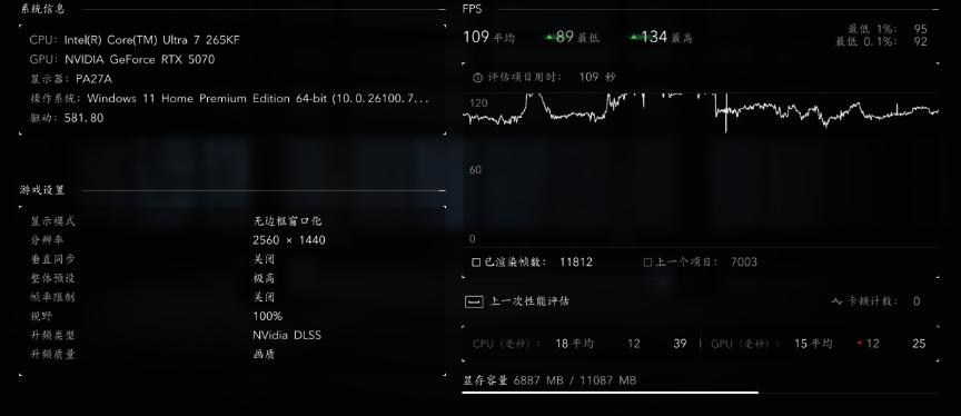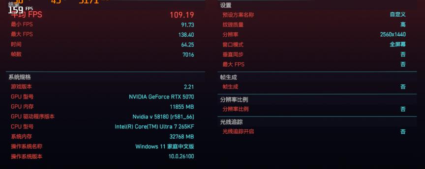 《赛博朋克2077》刚上市之时,算是主流硬件中的性能杀手,不过到了当下,对硬件的要求已经不算苛刻了,2k分辨率超级画质,关闭rtx和dlss,rog魔霸9x的平均帧速为109fps,最小帧速也达到了91fps,对于ultra 7 265kf而言,稳定流畅运行轻松愉快。