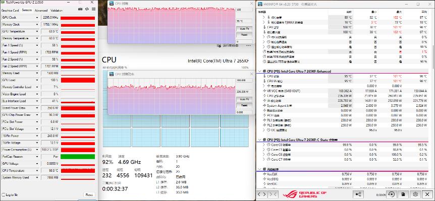 室温25℃左右,对rog魔霸9x进行处理器+显卡双烤机测试。持续烤机20分钟,处理器功耗为230w,温度约95℃。显卡功耗在250w左右,温度约64℃,整机稳定运行,同时整机功耗方面,双烤满载时整机插线板功耗约为595w,850w的电源足以应对。