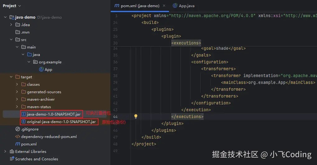 └── original-java-demo-1.0-snapshot.jar ← 原始包(备份),不能直接执行,只包含项目中自有的代码,menifest.mf文件中连main-class都没有。