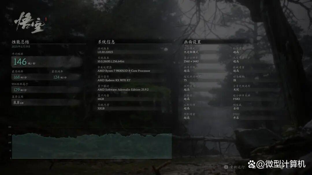 ▲搭配完全相同的显卡、使用相同的画面设置,锐龙7 9800x3d运行《黑神话:悟空》的平均帧率、最低帧率、最大帧率都优于酷睿ultra 9 285k。