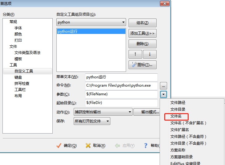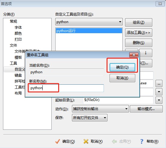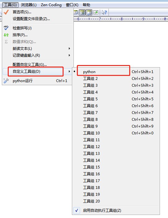 点击菜单栏“工具”选择“自定义工具组”点击刚刚添加的“python”