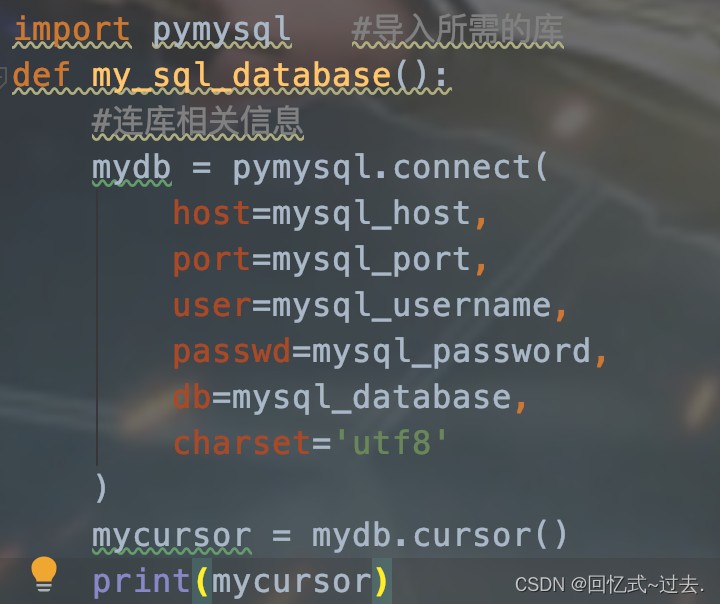 用pymysql模块中的connect连接数据库,同时用cursor()函数创建游标,用于接收返回的结果。