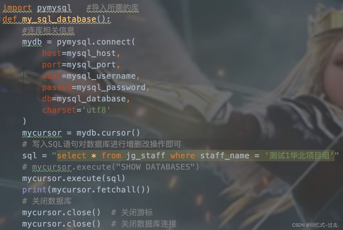mydb.commit() # 查询时不需需调用,此方法用于提交当前事务。如果不调用这个方法,无论做了什么修改,自从上次调用#commit()是不可见的