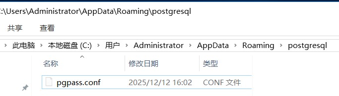 在该目录下创建文件 pgpass.conf(注意:不是 .pgpass,而是 pgpass.conf)
