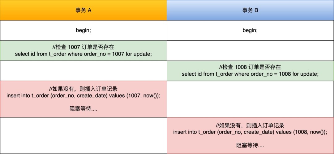 假设这时有两事务,一个事务要插入订单 1007 ,另外一个事务要插入订单 1008,因为需要对订单做幂等性校验,所以两个事务先要查询该订单是否存在,不存在才插入记录,过程如下: