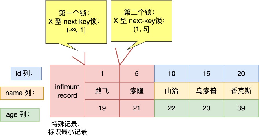 - 在 id = 20 这条记录的主键索引上,加了范围为 (15, 20] 的 next-key 锁,意味着其他事务即无法更新或者删除 id = 20 的记录,同时无法插入 id 值为 16、17、18、19 的这一些新记录。
