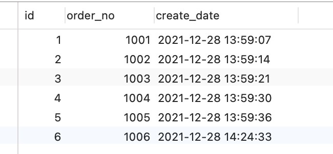 create table `t_order` ( `id` int not null auto_increment, `order_no` int default null, `create_date` datetime default null, primary key (`id`), key `index_order` (`order_no`) using btree ) engine=innodb ;