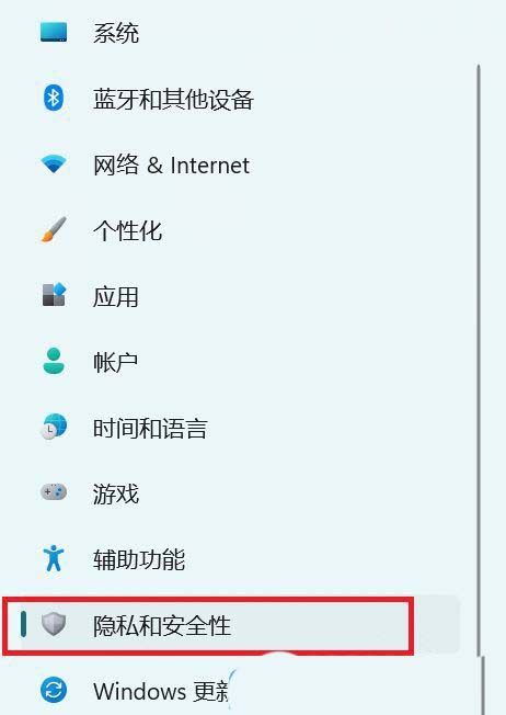 设置窗口,左侧选择隐私和安全性选项卡,并点击进入
