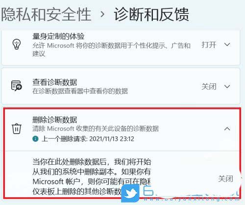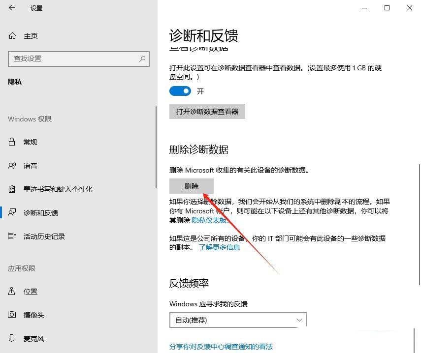 当前路径为:隐私和安全性 - 诊断和反馈,找到删除诊断数据(当你在此处删除数据后,我们将开始从我们的系统中删除副本。如果你有 microsoft 账户,则你可能有可在隐私仪表板上删除的其他诊断数据)选项,点击打开,再点击删除按钮就完成了