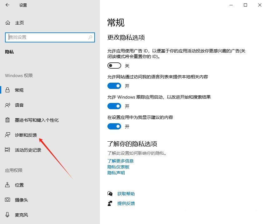 右侧的隐私和安全性下,找到并点击诊断和反馈(诊断数据,墨迹书写和键入数据,定制体验,反馈频率)