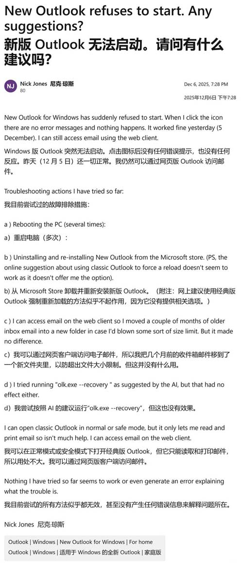 根据用户反馈,该故障仅局限于 windows 桌面客户端,网页版(web)及移动端 outlook 应用并未受到影响,用户仍可通过这些替代渠道处理紧急邮件。