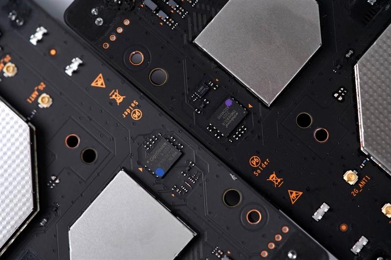 主板背面覆盖这一块巨大的黑化铝合金散热片,下面同样是辅助散热的金属屏蔽罩。