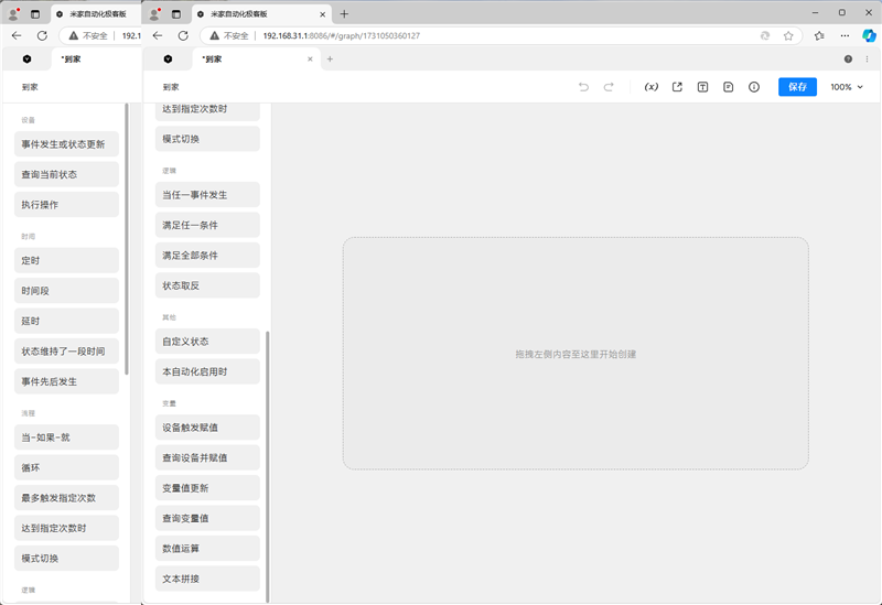 自动化功能应该是小米中枢网关中最有趣的部分了,左侧是各种设备,时间,流程,逻辑和变量指令块,拖到右侧区域,就可以组合成一条自动化动作。