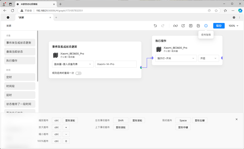 我也简单尝试了一下,但可惜只有一个设备可用,所以就设置了这么一条,当检测到我的手机连接到路由器时,打开路由器的指示灯。