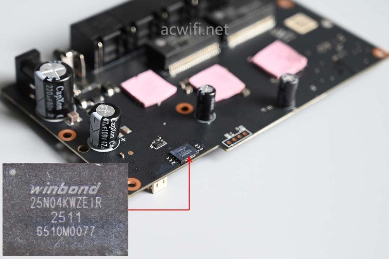 这里有一颗闪存芯片,型号是w25n04kwzeir,容量为512mb。(中枢网关需要)
