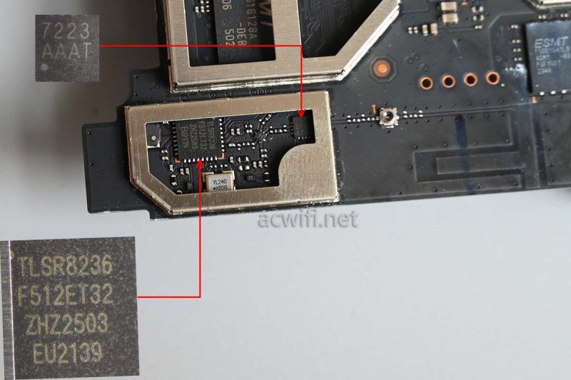 蓝牙芯片用telink的tlsr8236;丝印“7223”的芯片型号是卓胜微的mxd7223,集成了sptd+lna。