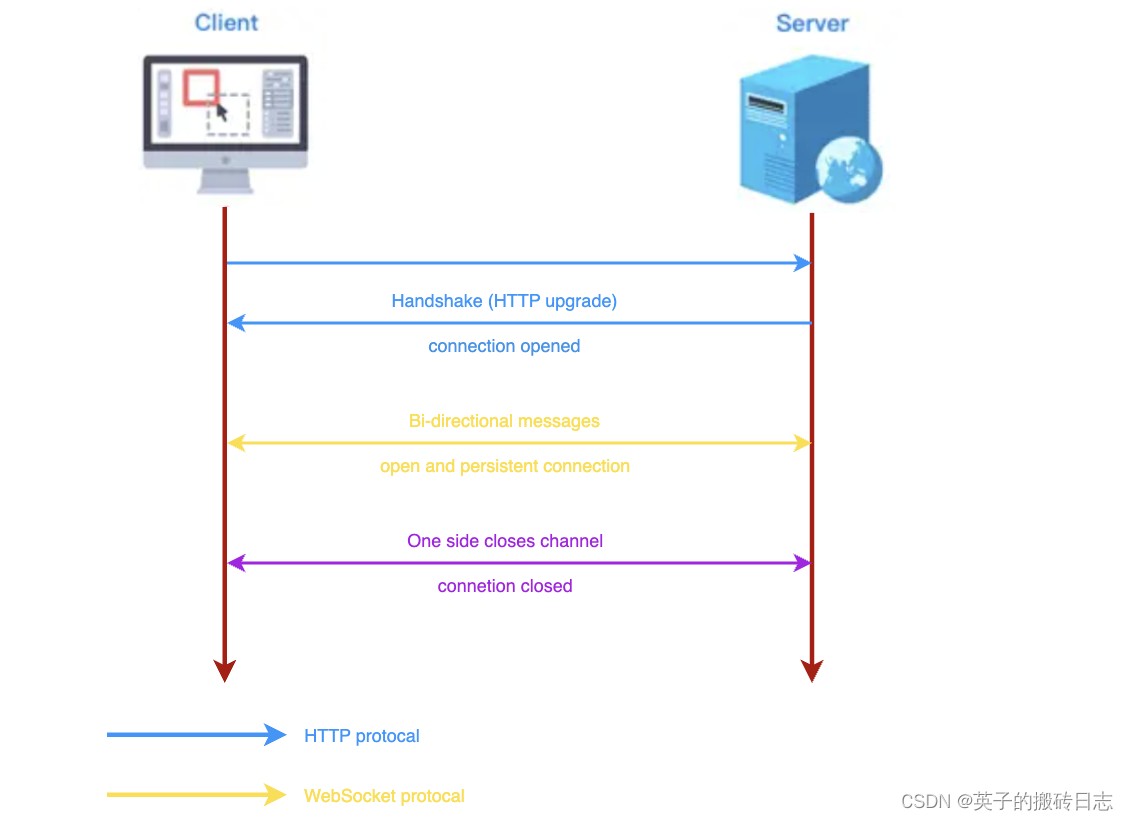 为了建立一个 websocket 连接,客户端浏览器首先要向服务器发起一个 http 请求,这个请求和通常的 http 请求不同,包含了一些附加头信息,其中附加头信息"upgrade: websocket"表明这是一个申请协议升级的 http 请求,服务器端解析这些附加的头信息然后产生应答信息返回给客户端,客户端和服务器端的 websocket 连接就建立起来了,双方就可以通过这个连接通道自由的传递信息,并且这个连接会持续存在直到客户端或者服务器端的某一方主动的关闭连接。