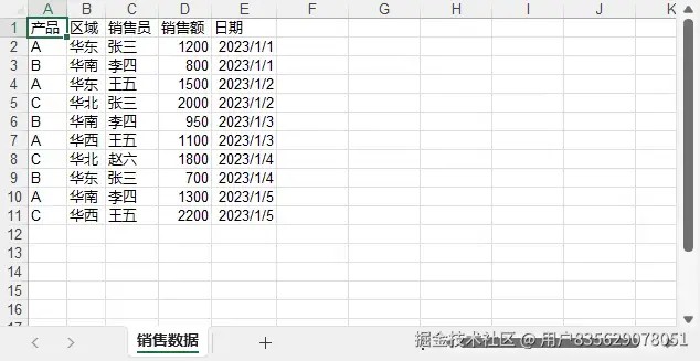 安装完成后,我们需要一些示例数据来演示如何创建数据透视表。以下python代码片段展示了如何使用该库向excel工作表写入一些模拟销售数据。这些数据包含了产品、区域、销售员和销售额等信息,足以支撑后续的数据透视表创建。