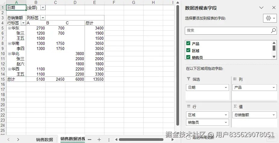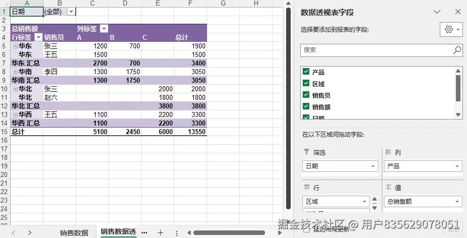 数据结构清晰是创建有效数据透视表的前提。在上述示例中,我们创建了一个包含“产品”、“区域”、“销售员”、“销售额”和“日期”等字段的表格,可后续的透视分析。
