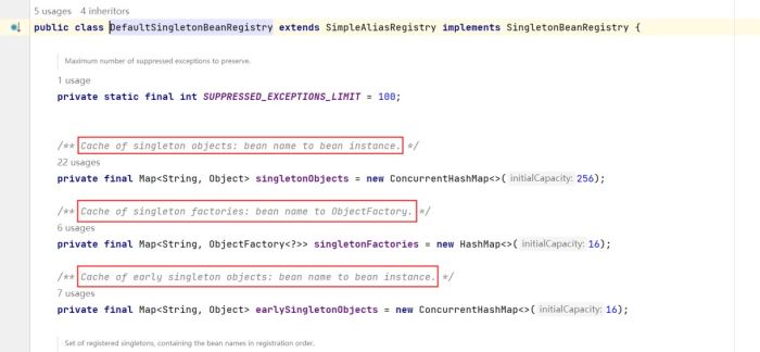 **cache of singleton objects: bean name to bean instance. **单例对象的缓存:key存储bean名称,value存储bean对象【一级缓存】