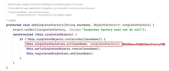 我们再来看,在该类中有这样一个方法addsingletonfactory(),这个方法的作用是:将创建bean对象的objectfactory对象提前曝光。