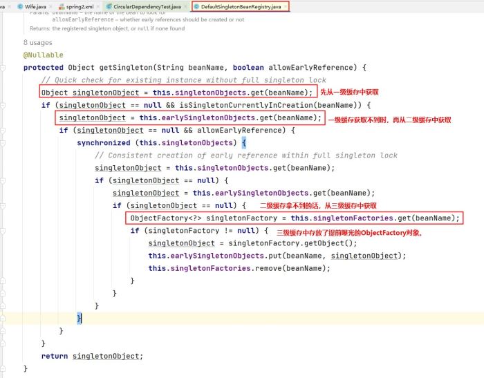 从源码中可以看到,spring会先从一级缓存中获取bean,如果获取不到,则从二级缓存中获取bean,如果二级缓存还是获取不到,则从三级缓存中获取之前曝光的objectfactory对象,通过objectfactory对象获取bean实例,这样就解决了循环依赖的问题。