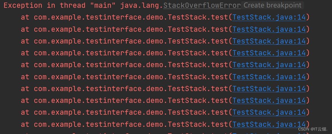 上面这串代码的执行过程是:线程先执行main方法,同时会创建main方法的栈帧插入到该线程的线程栈中,当执行到test()方法时,创建test()方法的栈帧插入到该线程的线程栈中,执行到test()方法里的test()方法时,创建栈帧,插入到线程栈中,后面进行不断创建栈帧、入栈。当创建一定数量的栈帧后,剩下的线程资源无法再创建新的栈帧就会报stackoverflowerror异常(堆栈溢出异常)(当前虚拟机栈不可以动态扩展)