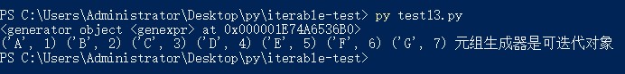g = ( chr(x) for x in range(65, 72) ) print( next(g), end=" " ) print( next(g), end=" " ) print( next(g), end=" " ) print( next(g), end=" " ) print( next(g), end=" " ) print( next(g), end=" " ) print( next(g), end=" " ) print( next(g), end=" " )