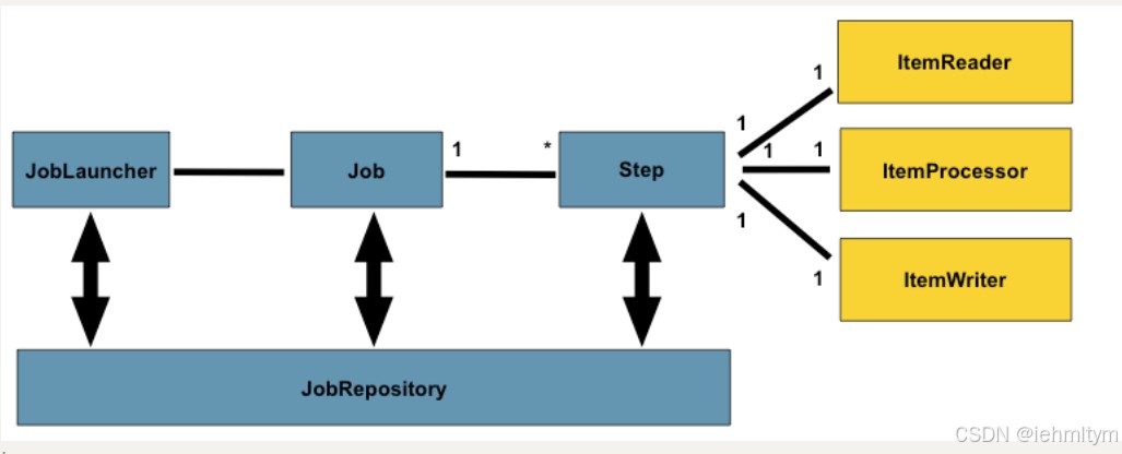 jobrepository: 保存job或者检索job的信息。springbatch需要持久化job(可以选择数据库/内存),jobrepository就是持久化的接口