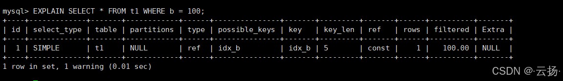 | ref | 基于普通索引的等值查询,可能返回多行 | select * from t1 where b = 100(b 有普通索引) |