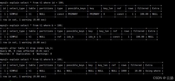| 无索引查询(删除 idx_b) | alter table t1 drop index idx_b;explain select * from t1 where b = 100 | all | null | 最差,全表扫描 1000 行 |