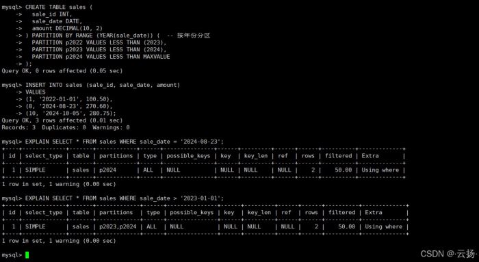 -- 查询 2024 年数据,仅命中 p2024 分区 explain select * from sales where sale_date = '2024-08-23'; -- 查询 2023 年后数据,命中 p2023、p2024 分区 explain select * from sales where sale_date > '2023-01-01';
