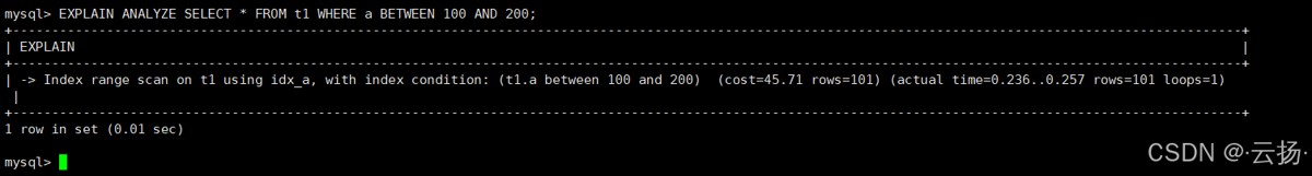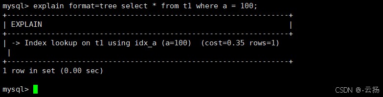 -> index lookup on t1 using idx_a (a=100) (cost=0.25 rows=1)